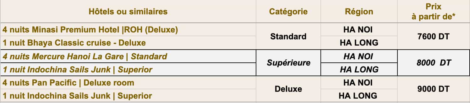Questions des voyageurs au Vietnam : Q : Quelle est la meilleure période pour visiter Hanoï ? R : La meilleure période pour visiter Hanoï se situe de septembre à novembre et de mars à avril, lorsque le climat est doux et agréable, avec peu de pluie, des températures confortables et des paysages parfaits pour explorer la ville et ses environs comme la baie d’Halong ou Ninh Binh. Q : Le voyage au Vietnam est-il sécurisé ? R : En général, le Vietnam est considéré comme un pays relativement sûr pour les voyageurs, et de nombreux visiteurs n'ont pas de problèmes majeurs pendant leur séjour. Q : Est- ce qu’on peut modifier la durée du circuit ? R : La durée du voyage Hanoi Beyong est flexible en ajoutant des nuits à Hanoï, vous avez aussi la possibilité d'ajouter des extensions Q : Est ce qu’on peut choisir des hôtels ? R : Oui Q : Ce circuit au Vietnam est-il adapté aux enfants ? R : Oui, le Vietnam est une destination recommandée pour un voyage en famille avec des enfants. Q : Quelles sont les extensions possibles avec ce circuit ? R : Il est possible de pronger votre séjour à Siem Reap au Cambodge, en Thaïlande, en Malaisie ou à Bali. |